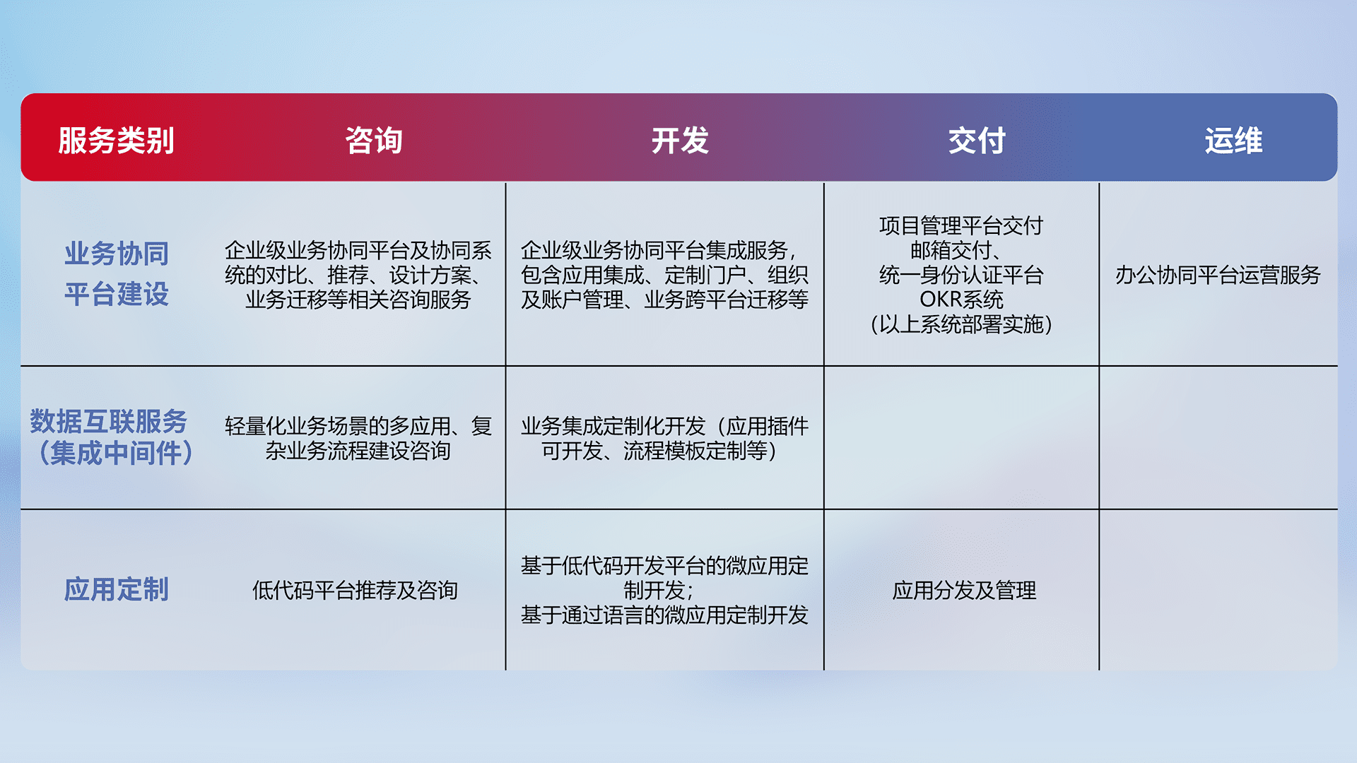 针对钉钉、、企微、、、IDaas等平台级产品提供产品的规划、、方案、、交付、、、、定制化开发等服务,,实现如统一协同办公、、、、智能客户服务、、、、混合会议管理、、、、智能数据查询、、、、等业务场景,,,,实现数字化转型。。。